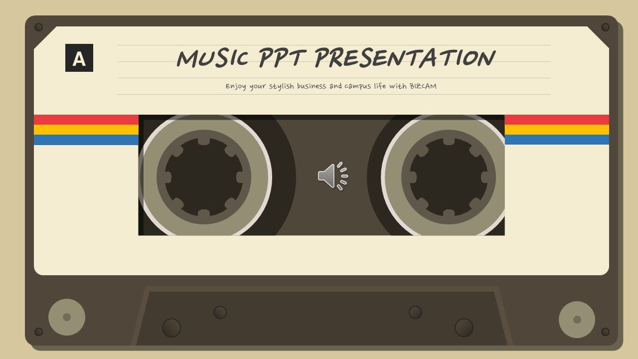 Template PowerPoint dengan gambar kaset pita (tape) yang sedang berputar. Media penyimpanan ini dulu sangat populer di tahun 1980an – 1990an, sebelum digantikan oleh compact disc (CD). Slide didesain dengan warna utama beige dan abu gelap yang memberikan nuansa retro yang kuat.