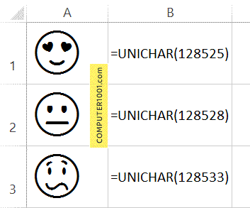 Klik sel yang ingin ditaruh simbol dan masukkan rumus =UNICHAR(kode simbol) seperti contoh gambar berikut (kolom B).